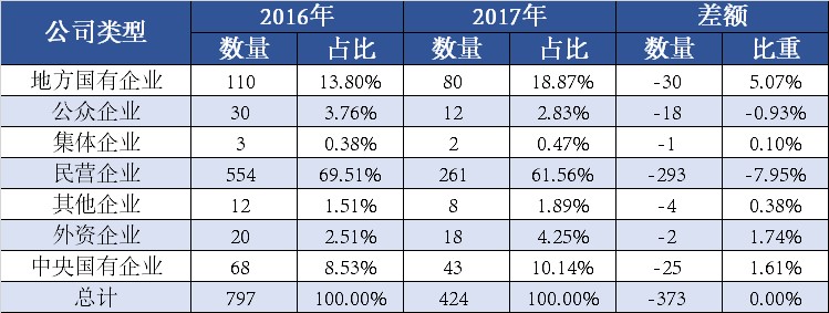将今年以来定增募资总额在50亿元以上的31笔定增涉及的上市公司的情况进行统计,结果显示,中央国有企业和地方国有企业分别有13笔和7笔,两者合计占比64.52%。2016年的情况则是上述两类企业占比仅为36.92%,民营企业则在纳入统计范围内的65家上市公司中独占31席,占比47.69%。