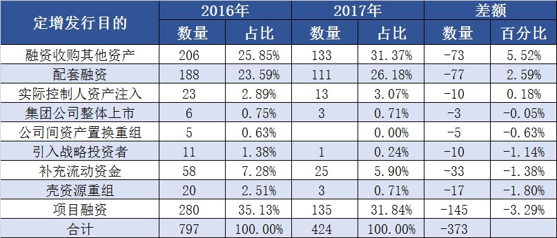 总体来看,今年以来项目融资、融资收购其他资产、配套融资等三项在发行定增的上市公司数量和募资总额方面均稳居前三甲,合计占比分别为89%和72%。对比今年和2016年上市公司发行各类定增的数量和占比情况,结果显示,各种类型的定增数量均有所下降,其中融资收购其他资产及配套融资两项所占比重有显著提升,项目融资和壳资源重组项目占比下降最多,公司间资产置换重组类定增项目则是从有至无。