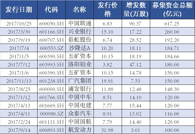今年以来上市公司定增募资总额最大的当属中国联通(600050.SH)。8月20日晚间,中国联通(600050.SH)发布的公告显示公司拟向包括中国人寿、腾讯信达、百度鹏寰、京东三弘、阿里创投、苏宁云商等在内的九名特定对象战略投资者非公开发行不超过约90.37亿股股份,募集资金不超过约 617.25 亿元,发行价格为 6.83 元/股。上述定增股份于10月31日正式上市,锁定期为3年。