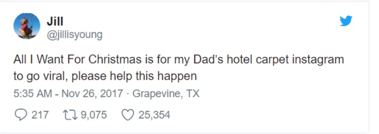 该账户的“地毯首秀”发布于2015年8月27日,图案取自辛辛那提机场。自那以后,Bill陆续发布了来自其他场所的地毯美图,不过最终只收获了寥寥83个粉丝。见此状况,Bill19岁的女儿在推特上替爸爸许愿——“希望这个圣诞节,我爸爸的地毯图能火爆Instagram!求帮转!”Bill的账号果真快速蹿红。仅仅几天之内,涨粉推送刷爆了Bill的手机,甚至害他不得不时常把手机调成飞行模式。现如今,Bill的地毯号已拥有超过62万粉丝。在女儿的帮助下,Bill提前实现了自己的圣诞心愿。