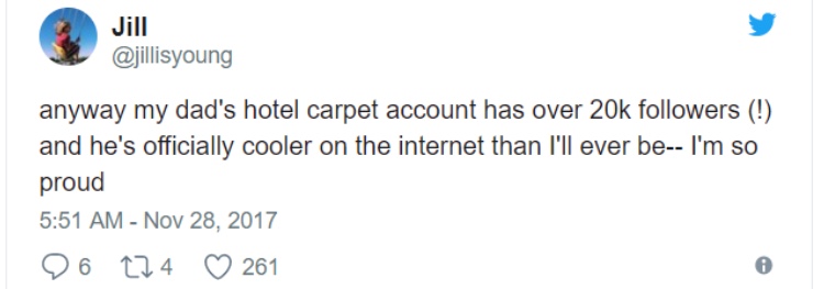 此后,Bill的账号myhotelcarpet迅速蹿红。11月27日,女儿Jill再度发推: