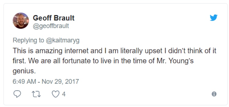 嫉妒羡慕恨的网络路人Geoff Brault也在11月29日回复: