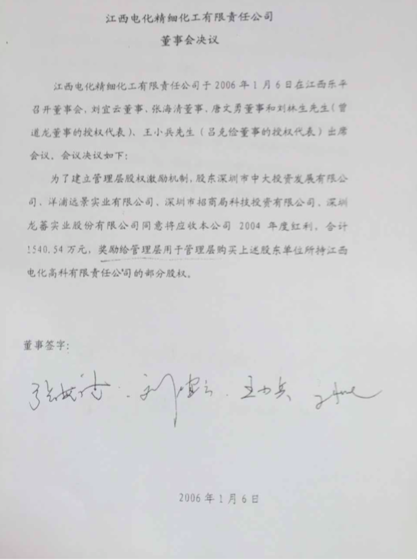 这一事件可追溯至2006年。彼时,世龙实业前身江西电化精细化工责任有限公司(下称电化精细)曾召开过一次“特殊”的董事会,讨论建立管理层股权激励计划。