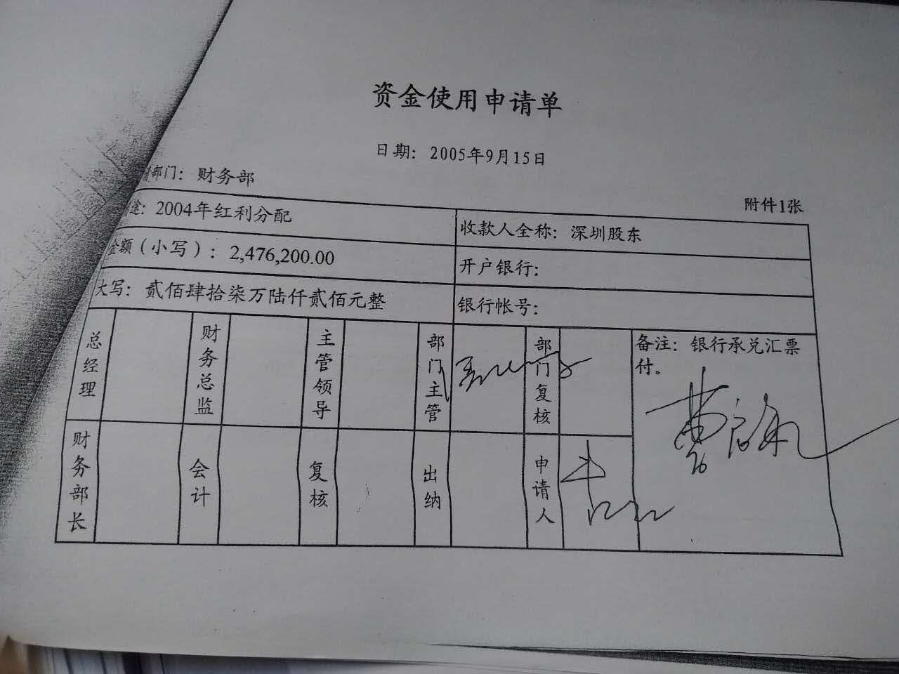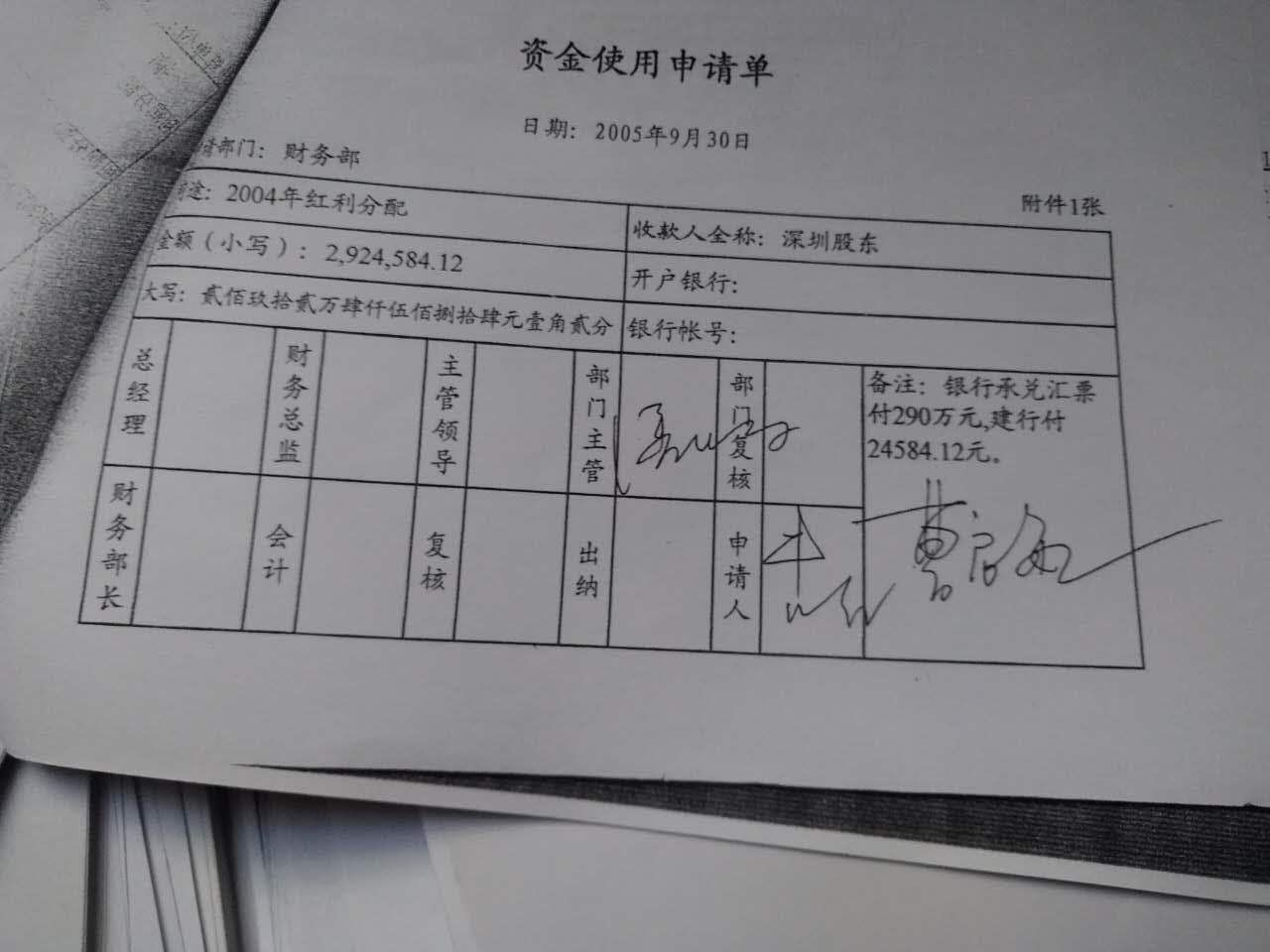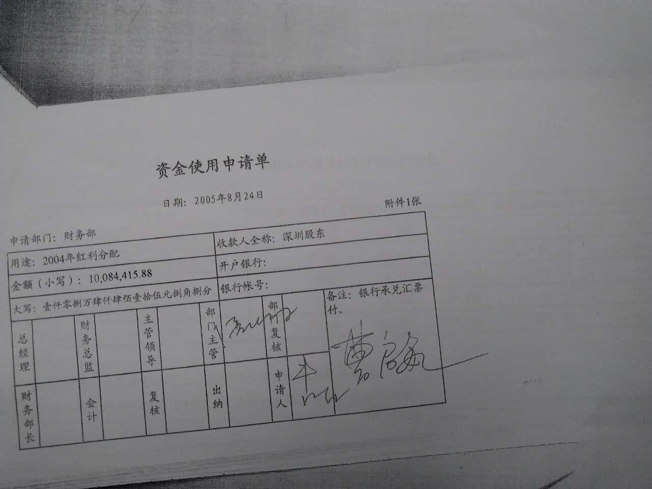 界面新闻所获一份资金使用申请单显示,电化精细先后在2005年8月24日、9月15日、9月30日通过银行承兑汇票支付深圳股东方1008.44万、247.62万、292.58万的红利分配。