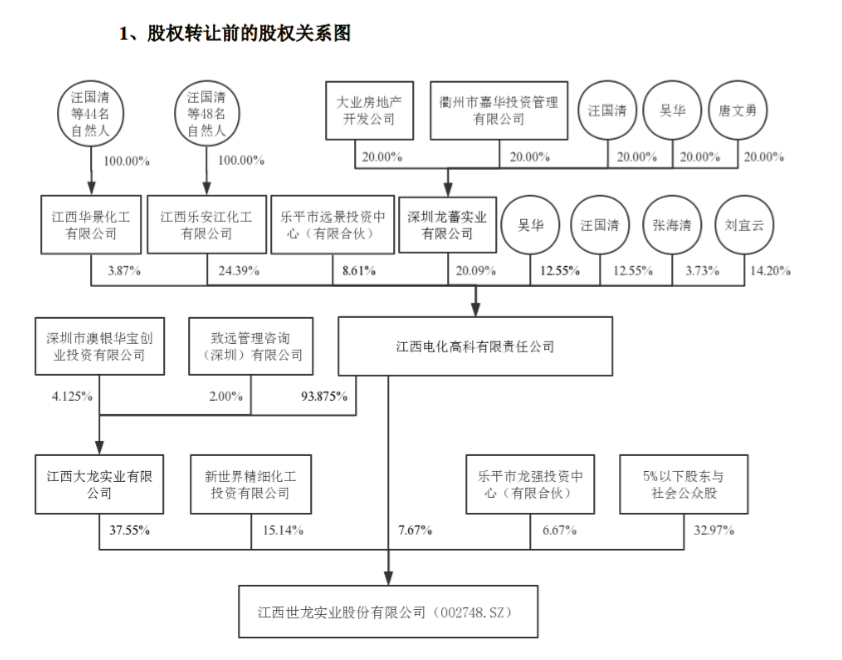 资料显示,世龙实业的间接控股股东电化高科由乐安江化工、龙蕃实业、吴华等八名股东共同持股。截至目前,上述股东中无单一股东持股超过电化高科总股本的50%,也无单一股东或关联股东能够对电化高科股东会、董事会行使控制权。