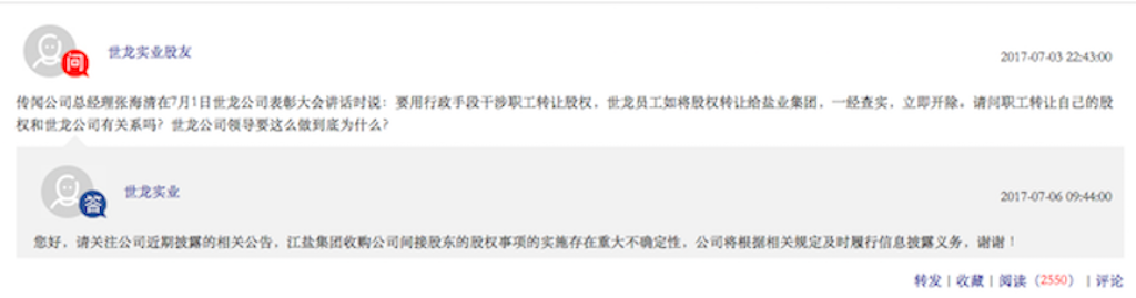这并非易事。有市场传闻称,世龙实业总经理张海清用行政手段干涉职工转让股权,世龙员工如将股权转让给江盐集团的,一经查实,立即开除。