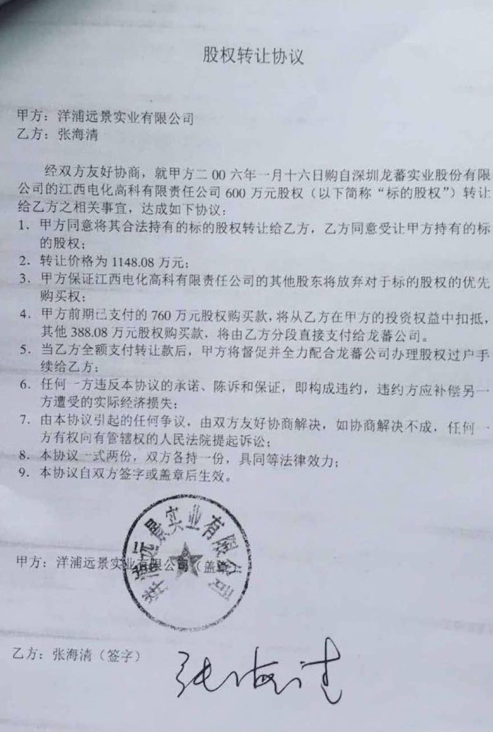 由于当时尚未制定股权激励计划,龙蕃实业曾与洋浦远景草签股权转让协议,约定股权激励股份暂时由洋浦远景代持,但2013年8月,张海清在未征得龙蕃实业和其他股东及管理层其他成员同意下,将这600万股过户到其个人名下。