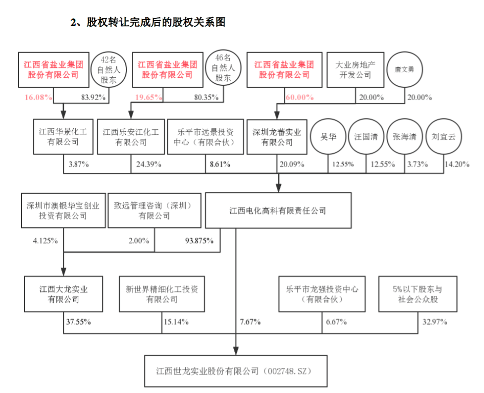 上市两年后,赣企世龙实业(002748)迎来了重大经营格局变更,具有国资背景的江盐集团忽然闯入,意图控股包括龙蕃公司在内的三家世龙实业间接股东。在交易完成后,江盐集团对世龙实业间接控股股东电化高科的直接持股将超过1/3,若江盐集团进一步与其他间接股东构成一致行动人,则可导致世龙实业实际控制人变更。