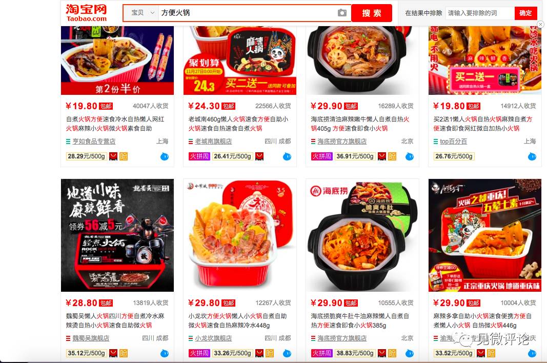 在淘宝网上搜索关键词“方便火锅”,你可以搜出众多品牌,其中不乏海底捞、德庄、小龙坎、井格等知名火锅连锁品牌,平均价格在20元左右,销量最高的月销量甚至高达12万件左右。