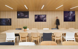 全木质自助餐厅,黑白相间的楼梯间,深蓝色休息室,在这里,具有设计感又不会让人感到压力的环境,使得工作和娱乐的界限变得模糊而值得玩味。