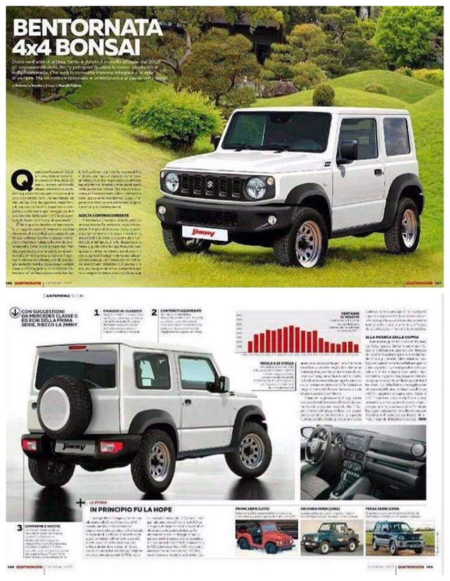 第二组照片则是来自于意大利汽车杂志Quattroruote的电子扫描件(尚未刊发),扫描件中显示的车辆已经挂上了JIMNY的车牌,外观与上一组工厂中的车辆一致,只是车底裙边、轮眉处多了黑色覆盖件。这份图片的流出几乎可以让人肯定,全新一代吉姆尼的造型99.99%与此前曝光的PPT照片一致。