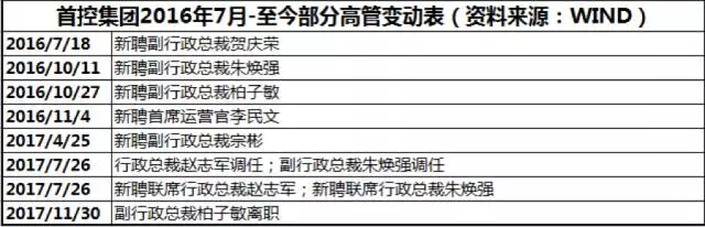 自2016年7月起至今,首控集团层面的高管变动较为频繁。最近的就是11月30日,副行政总裁柏子敏辞职。