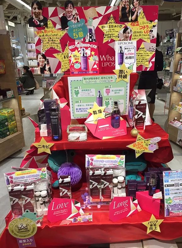 除了拼价格还能拼点啥?日本药妆店和百货人气排名的飞标(价格牌和显眼的标记)可谓是花式撩人,尤其在@cosme store 贝尔大厦的新宿店,未进店就看到了“2017年最新热门话题商品集合”,告诉顾客今年发售了哪些热门商品,哪些热度正在上升。一进店,就看到面膜、洗面奶、化妆水、唇膏、粉饼、入浴剂等细分品类的排名,都是其@cosme网站评选TOP前五人气产品,排名第一的产品还会贴上“@cosme 第一位”、“@cosme store 洗面奶品牌第一位”等标记。根据季节,店内还设有保湿产品、护发三步骤等集合。