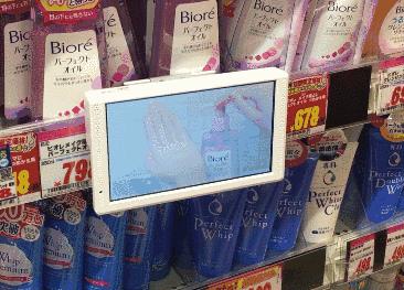 由于日本店铺寸土寸金,不似国内集合店背柜的“豪华”,所以药妆店的开架区、品牌背柜、活动专区均有小型的电子屏,有的是使用教程,有的是广告视频,有的播放的是宣传片。所以不了解的顾客可以花几秒的时间来了解企业品牌、产品功效和用法。但在国内,除了大型卖场和化妆品集合店的品牌背柜镶嵌了LED屏幕,则较少见这类mini电子屏。