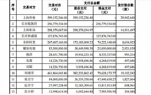 杨洋持有悦凯影视1.7%股份,将获得现金支付853.55万元,发行股份数99.53万股。上海柜汤、长兴和盛源两家公司的股东都是杨洋的父亲杨国平和母亲陆新源,前者是获得股份对价,后者是现金对价。而这两家公司合计持有悦凯影视25.52%的股份,再算上杨洋自己在悦凯影视1.7%的持股,杨洋一家三口共持有悦凯传媒27.22%的股份。重组完成后这部分股份价值约4.55亿元,其中套现约1.36亿元,获得股份对价约为3.19亿元。