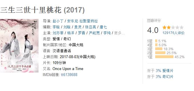 杨洋今年话题最高的作品就是暑期档上映的《三生三世十里桃花》,电影票房5.3亿元,豆瓣评分4.0分,演技差是这部电影最大的缺点,杨洋也被推向风口浪尖。另一部影片《建党伟业》,杨洋在其中的演技也没有太多长进。如果单看流量,杨洋是不用担心,粉丝经济在《三生三世十里桃花》中已经贡献了“锁场”现象,他作为偶像明星,有极高的曝光率,身后也有粉丝基础大的后宫团,商业价值高。