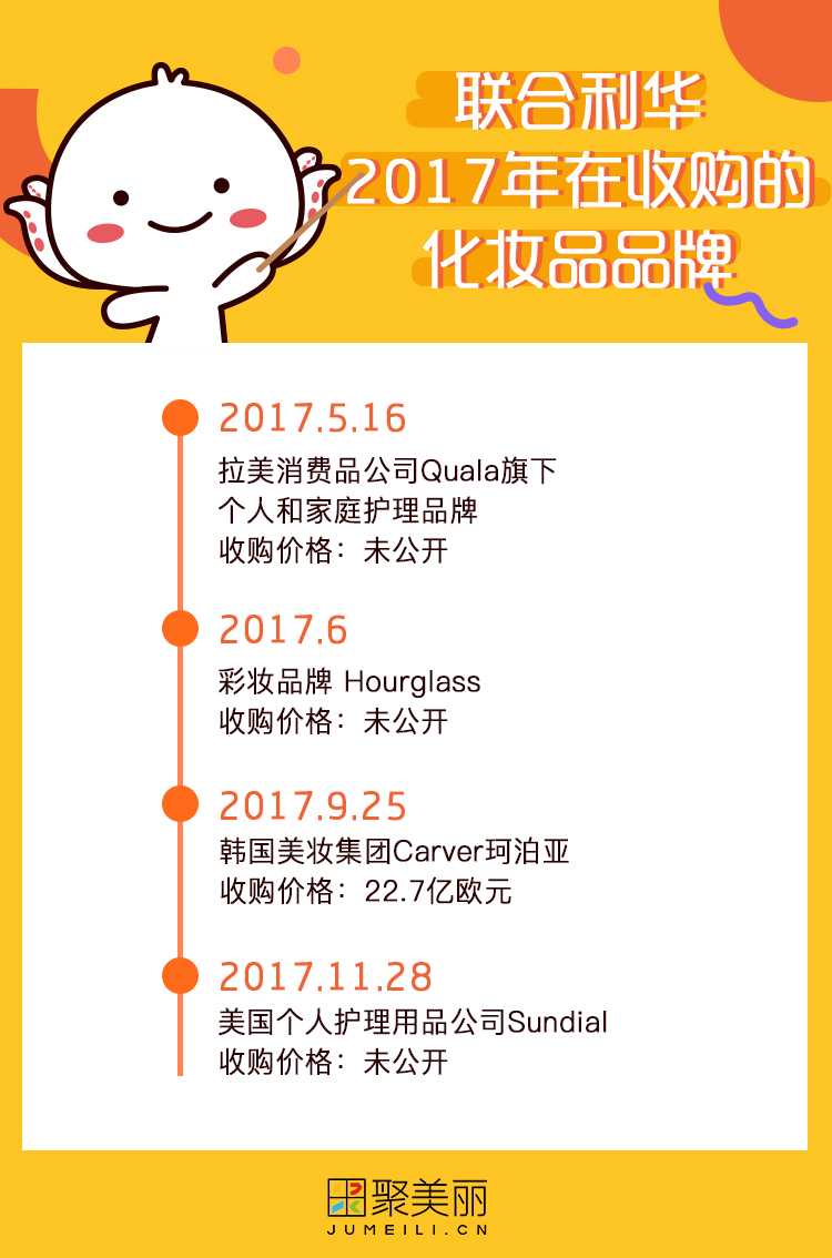 为了让大家一目了然,聚美丽特意制作了一张图,看看联合利华今年都收购了哪些化妆品品牌。