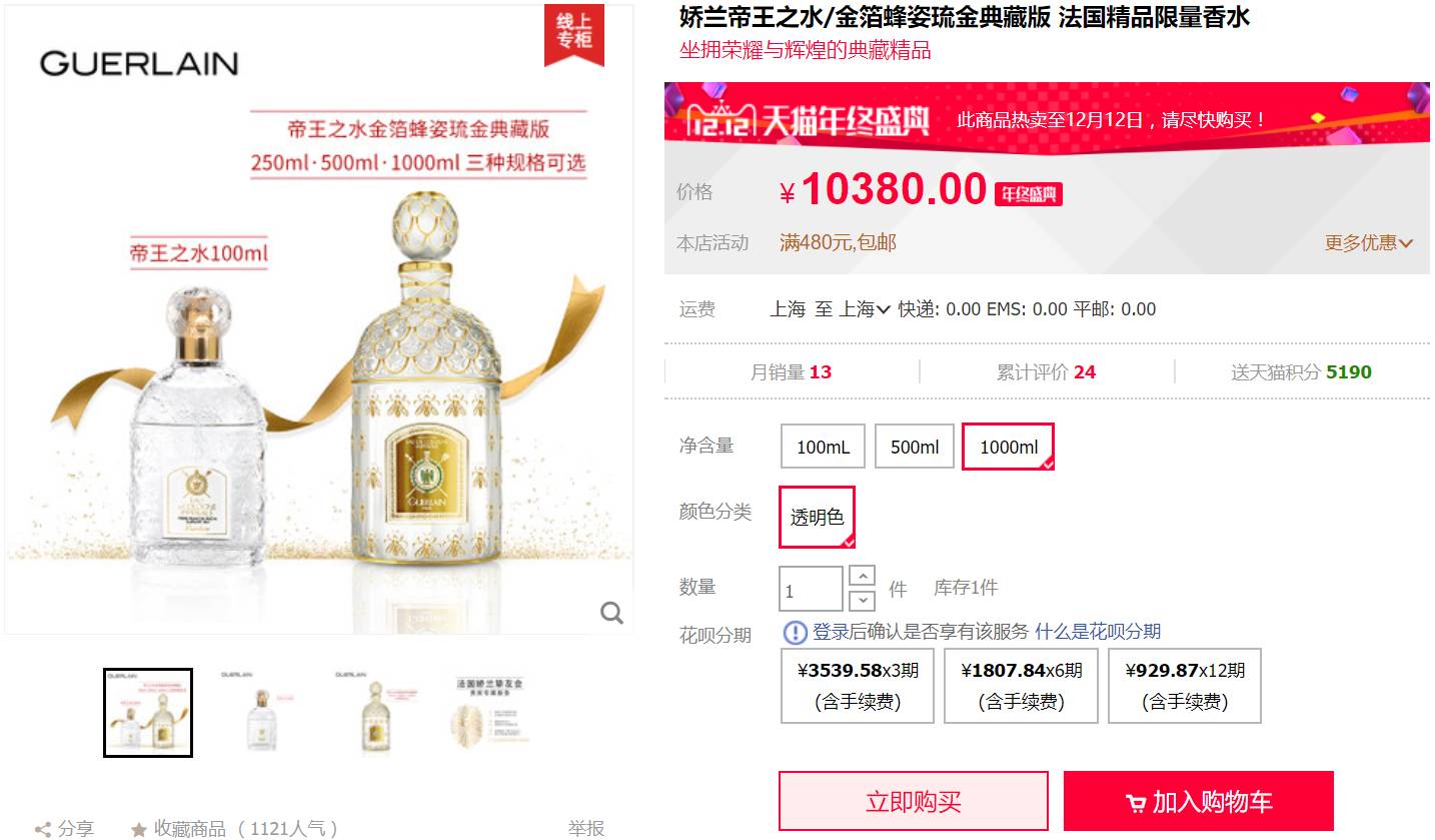 不过正如前文所提到的,最低售价850元、容量为100ml,最高售价10380元、容量1000ml(通俗来说就是两斤多)的帝王之水,在娇兰天猫旗舰店的销售情况并不好。