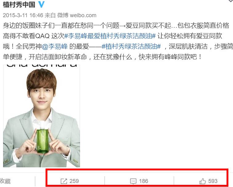 2015年2月,李易峰代言植村秀,不过没有掀起多大的水花,首条代言官宣微博转发堪堪数百。同年7月,美宝莲官宣吴亦凡为其代言人,并于次年推出合作款气垫BB,吴亦凡携自己设计的美宝莲气垫BB在b站进行直播活动,最高同时观看人数高达11万人。2015年8月,娇兰和杨洋的合作铺开,也就是前文那只广告片上线的时期。