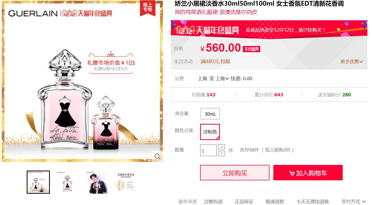 相比之下,娇兰天猫店里,正常规格的小黑裙香水的月销量就有143件,是帝王之水的十倍多(同样是截至12月12日上午十点的数据)。