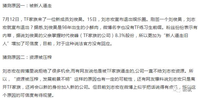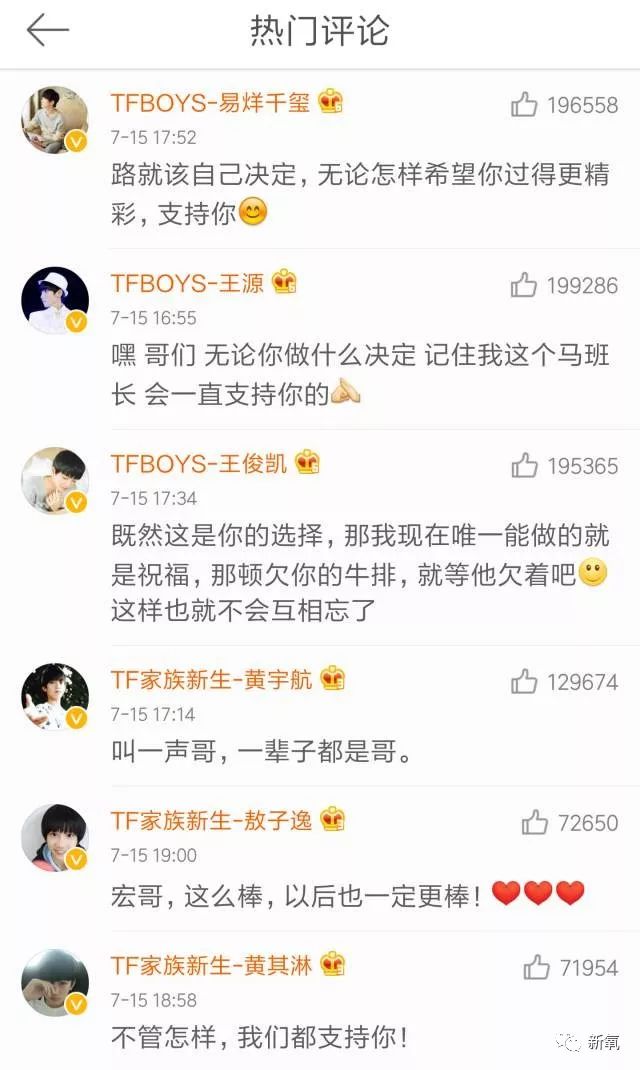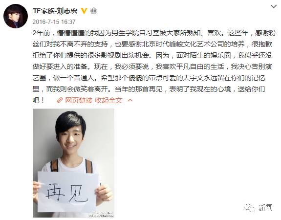 从这之后,微博除了分享点生活事,就很少再见到刘志宏的身影了,再之后就是去年7月15号那条“再见”微博。当时毫无征兆的炸出这条博文,之后就是同公司的TF小师弟们齐刷刷的留言祝福。
