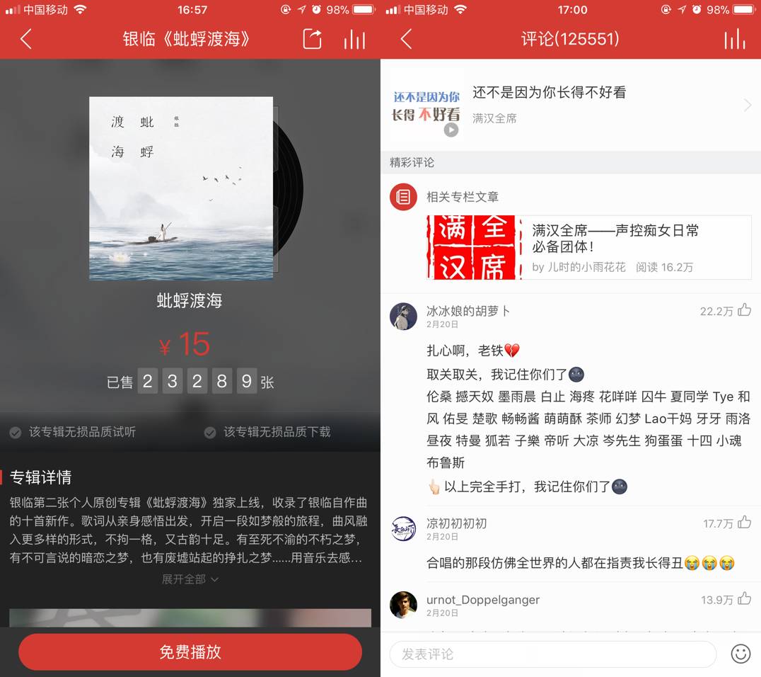 △满汉全席热门歌曲《还不是因为你长得不好看》在网易云音乐评论数超12万;银临15元/张的数字专辑《蚍蜉渡海》在网易云音乐售出23289张