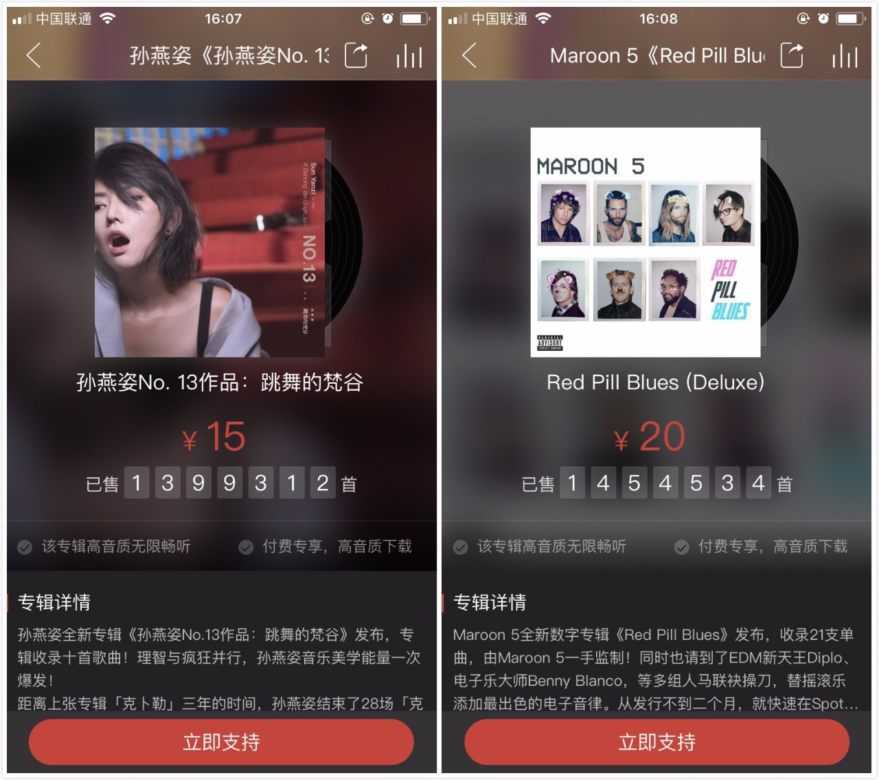 能有如此发展规模和速度,背后还是显示出网易云音乐强大的运营能力。在截至11月21日的数字专辑销量统计数据中,有包括孙燕姿《跳舞的梵谷》、Maroon 5《Red Pill Blues》、Sam Smith《The Thrill Of It All》、谢春花《知非》、李志《李志、电声与管弦乐》及好妹妹《实名制》等等在内的13张国内外歌手的数字专辑,相较其他数字音乐平台,均在网易云音乐取得了最高销量。