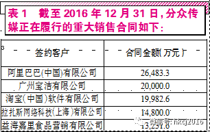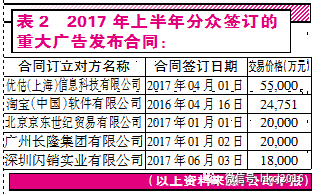 通过表1、表2,可以看出到2017年上半年,公司签约的第一大客户的投放金额已经比2016年前年翻倍,且像老客户“淘宝”的投放金额仍在提高。