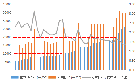 成交楼面价20000元/㎡以上地块:高价地定价与成交楼面价比值仅为1.3~1.6倍区间,盈利空间着实有限,同时在整体楼市调控趋紧的背景下,高价地普遍开盘去化表现平平。