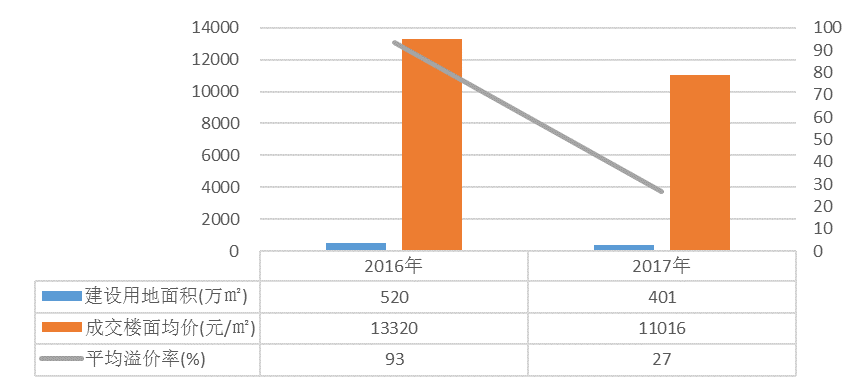 2017年苏州市区土拍宅地多项指标下滑显著。其中宅地总成交建设用地面积401万方,相比2016年下降119万方,同比降幅23%;平均溢价率下滑最为明显,同比降幅71%,而整体成交楼面价同比下降仅为17%,究其原因,主要以下几点:一是政府依据去年土地成交行情抬升了地块底价;二是对楼市未来预期不确定,销售压力悄然增加,也使得房企的投资趋于理性;三是地块出让限制条件越来越多,比如商业自持、配建人才公寓等,也降低了房企的拿地热情。