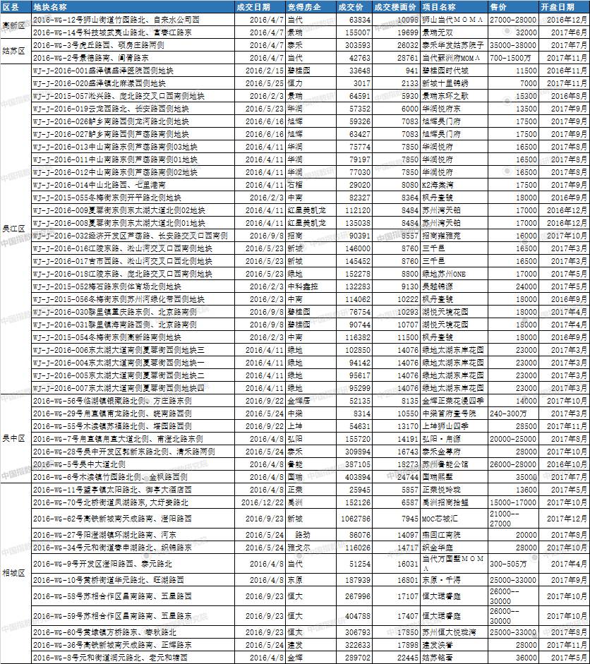 附苏州市区2016年土拍宅地已开盘项目明细