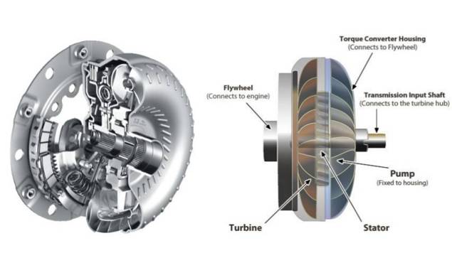 液力变矩器内部的 泵轮 导轮 和 涡轮 侵泡在ATF油液内,发动机输入的动力带动泵轮,泵轮旋转搅动ATF油,ATF油随后带动导轮 动力最终通过涡轮输出到变速箱。因为液力变矩器是靠油液传递动力,停车时哪怕不挂空挡,发动机也不会熄火,ATF油可以吸收发动机动力并转化成热能。