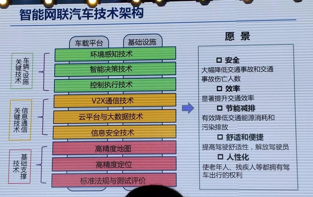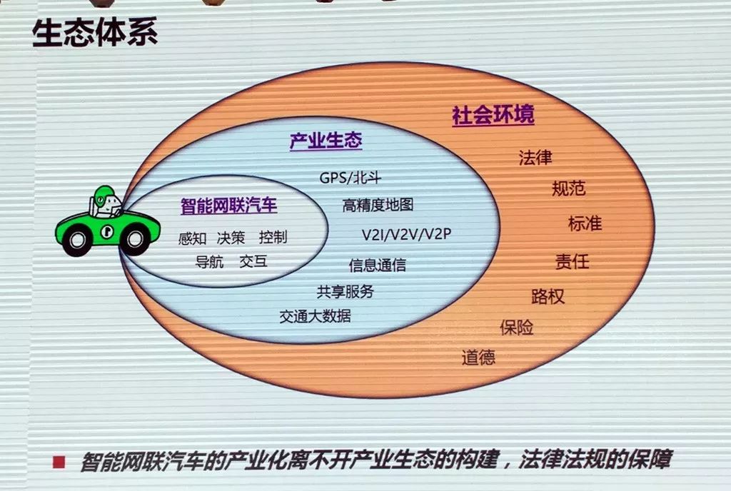 往上,是车辆与环境、与整个交通体系的、与法律法规等的适配。往下,是通信技术和法则、感知设备、车载设备、道路设施、高精度地图、决策逻辑算法等的大融合。