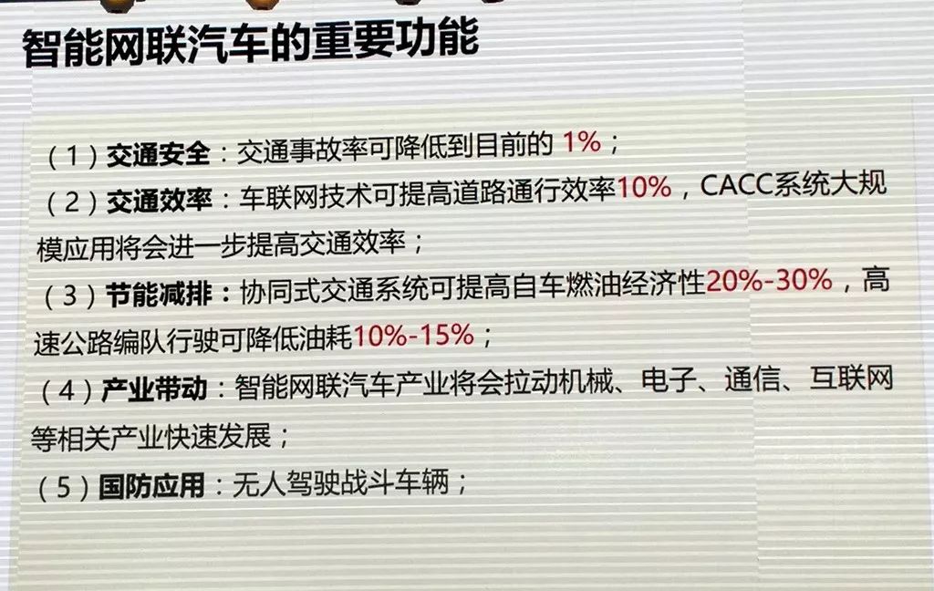 发展智能网联汽车的功能将涵盖:交通安全、交通效率、节能减排、产业带动、国防应用等多方面。