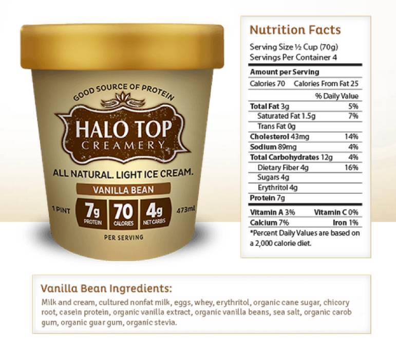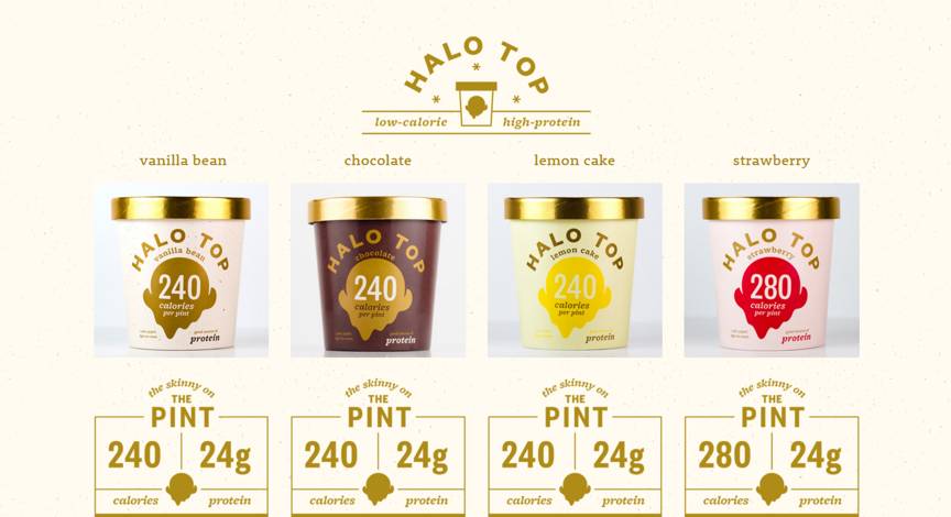 Halo Top对消费者的吸引力非常简单:每盒规格为一品脱的产品只有240~360卡路里的热量,低糖、高蛋白,而哈根达斯或Ben&Jerry中热量最低的香草口味,其卡路里也高达1000。Halo Top冰淇淋中蛋白质的含量达到每品脱含有20g。