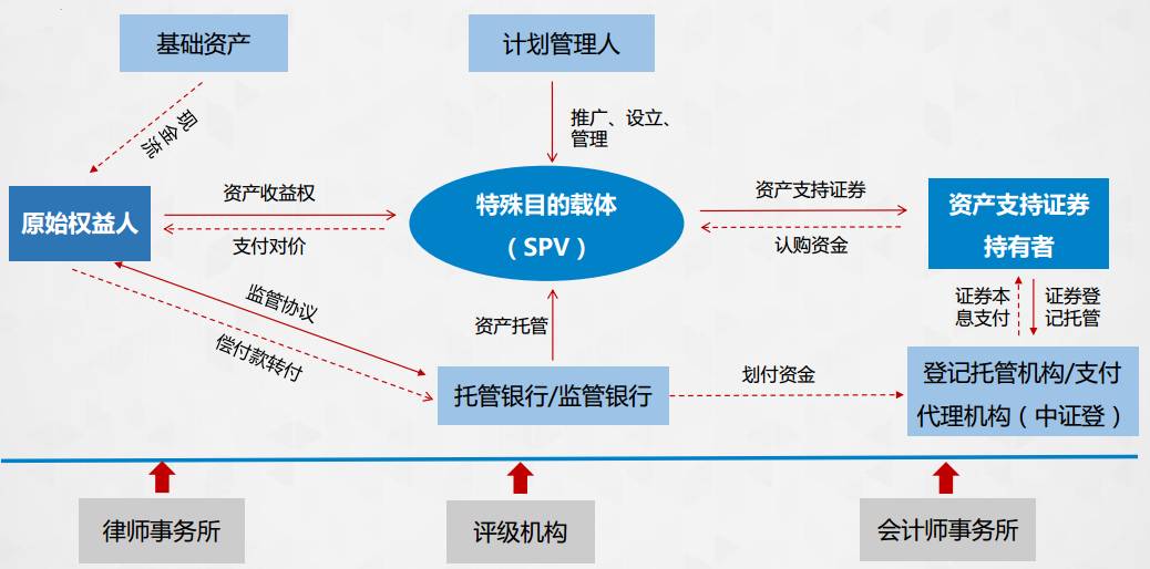 4. 基础资产要求拥有持续地可预计的现金流产生能力:典型的基础资产包括:普通贷款,住房、汽车抵押贷款、信用卡消费贷款,企业应收账款,不动产、基础设施的收益权等;