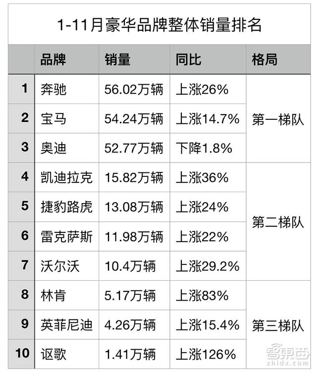根据乘联会的数据,在国内豪华车市场分为三大梯队,第一梯队是BBA,其在1—11月的整体销量都在50万这个级别,产品力强的同时还有强大的品牌认知,是国人购买豪华车的首选。