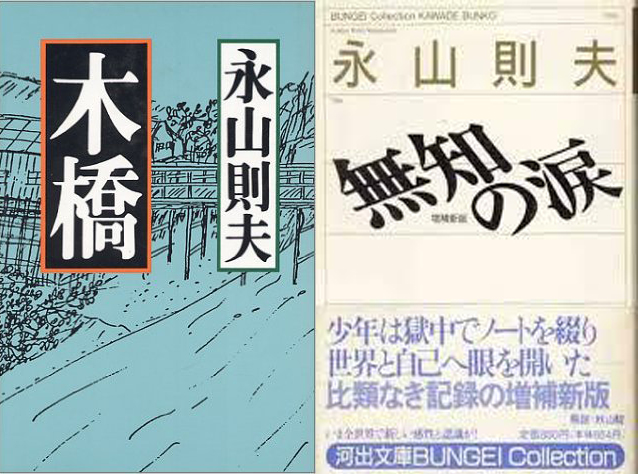 由死刑到无期徒刑,也许为永山带来了安静与祥和,他接连写出了《为什么?网走》《土堤》等小说。每一部作品都是以“N少年”为主人公,情节也是根据永山自己亲身体验过的被遗弃、极度贫困的生活、离家出走、偷渡等创作而成,因此极具真实感。在收录了四篇小说的《木桥》获奖之后,立风书房又发行了这部作品集的单行本。永山从小就很善于画画,因此这些作品的封面全部由他手绘而成。