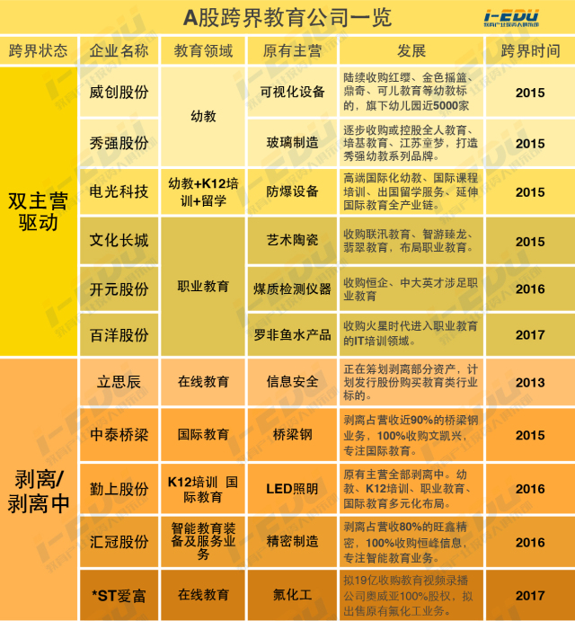 目前A股跨界教育的公司可以按跨界程度分为两类,一类公司是,提出“双轮驱动”,打造双主营业务的同步增长。另一类公司是,已经开始剥离部分,或者全部原有主营,彻底转型,要做纯的教育标的。但是,所有正在剥离原主营的这些公司,曾经都喊过“双轮驱动”的口号,都曾打造双主营的概念。