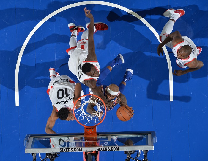 首节双方比分交替上涨,没能拉开差距。进入次节后萨里奇与约翰逊上篮得分,麦克内尔命中三分球,76人逐渐拉开比分。然而第二节后半段时,猛龙失误增多,获得机会的76人顺势将分差拉开到两位数。半场结束时,76人以65-52领先。