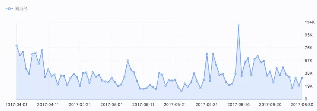 参加节目之前,刘昊然的百度指数几乎可以忽略不计,在节目播出的5月到7月间,百度指数呈垂直式上升,最高达到153595次。节目结束之后,百度微指数虽然趋于平稳,但基本保持在20000上下,是节目开播前的10倍。