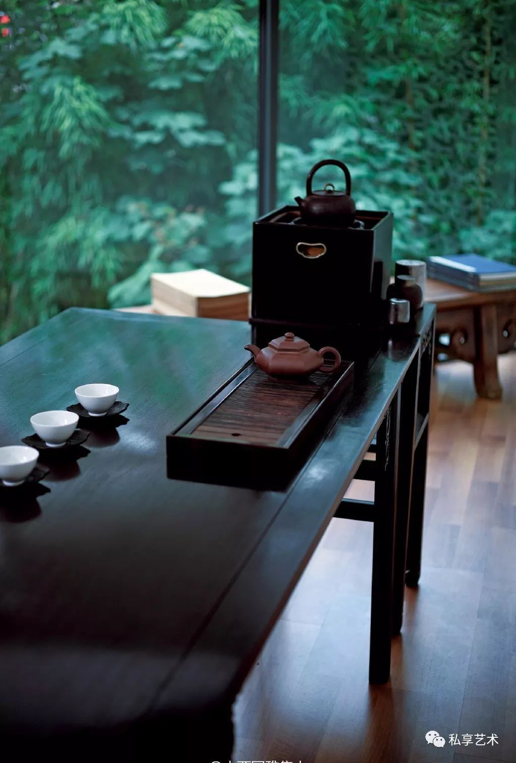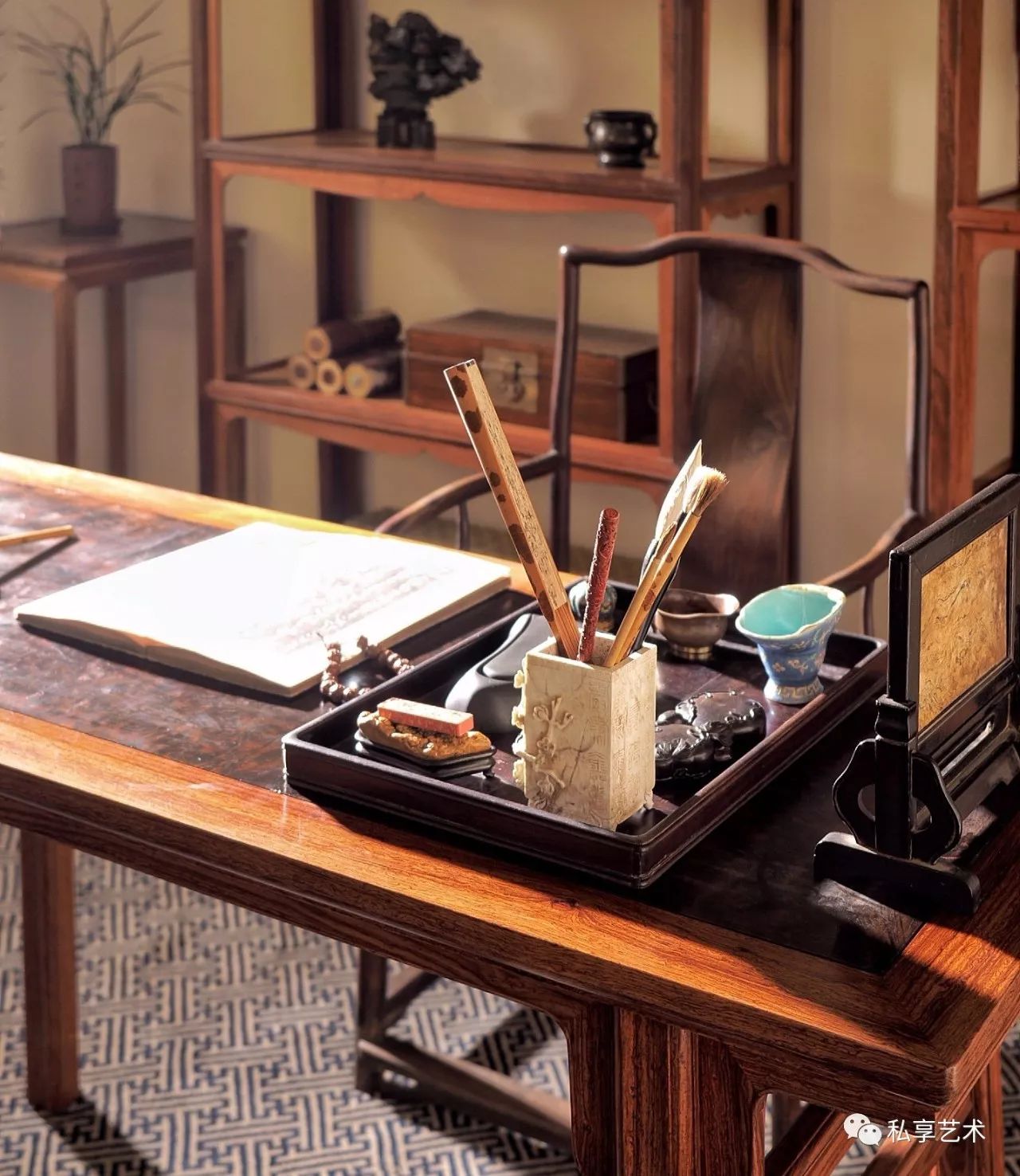 明式家具的陈设一定要取均匀、平衡之美,比如书房布局,就讲究高低错落有致。