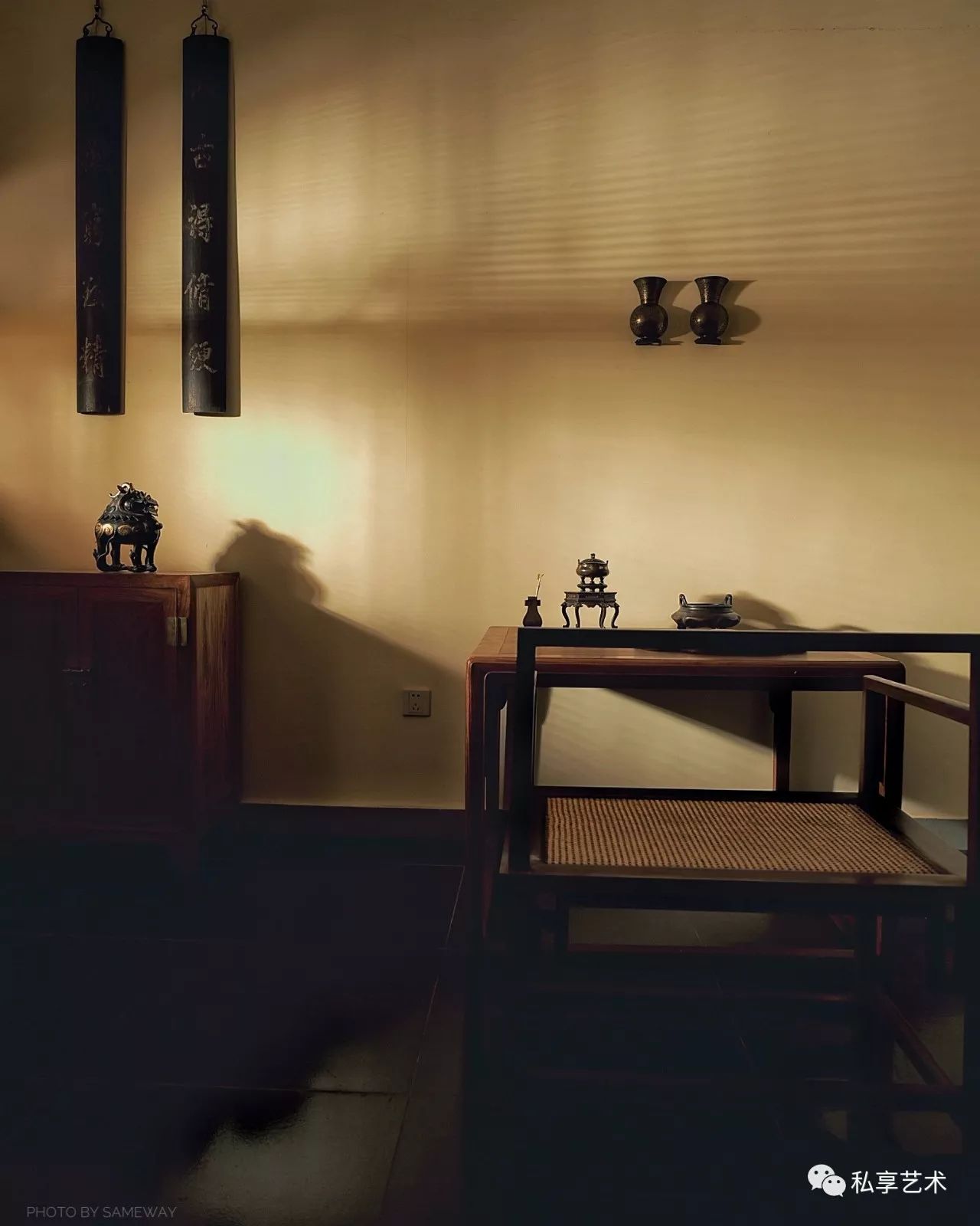 居于书房核心的便是占地面积最大的画案,画案的背后居中的是一把高大的官帽椅,再往后就是贴墙摆放的一组书柜,画案的侧面则放置一对圈椅,高有书柜低有方几,最简单的书房家具布局同样演绎着高低错落的不均衡之美,再有就是画案前的圈登或与圈椅遥相呼应的琴桌。