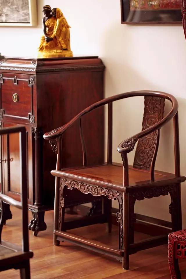 圈椅的行最能体现明式家具的灵韵,最基本的圈椅是素圈椅,注重通体的光滑素雅,椅盘之上为圆木椅圈后背和扶手一顺而下,注重肘部、腹部、臀部的支撑。椅盘之下外圆里方,三面素牙条,暗合天圆地方的传统思想。整体除靠背板上有简单的雕刻,扶手鹅脖之间有晓得角牙之外再无其他的装饰。