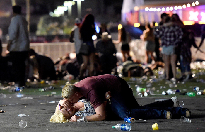28. 2017年10月1日,美国拉斯维加斯,曼德勒海湾赌场附近的乡村音乐会发生枪击事件后,民众逃离现场,一名男子伏在一名女子身上。此次事件造成59人死亡,成为美国现代历史上最惨重的枪击案。凶手帕多克是一名生活富足的退休白人会计,拥有大量枪支,在案发后饮弹自杀。警方至今不清楚凶手的作案动机。