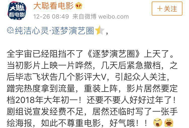 年末将至,当各大投资方再三衡量、精打细算“算计”着一年一度最为重要的春节档时,万万没想到,豆瓣评分只有2.1分的《纯洁心灵·逐梦演艺圈》前来送“贺礼”,其官方微博正式宣布《逐梦演艺圈》重新定档2018年大年初一。