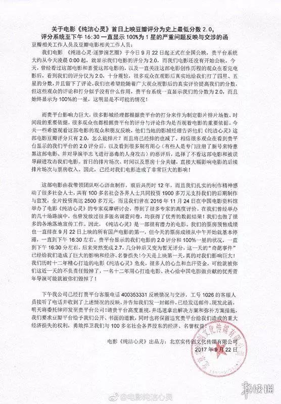 于是,毕志飞带着“电影情怀”与各大社交媒体展开了一场年度撕x大战。最严重的要属9月份与豆瓣网展开的撕X官司,当时片方官微发函,称豆瓣2分导致电影排片降低,很多观众会被误导,甚者攻击该片,已经对电影造成了巨大影响。
