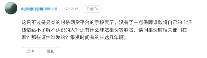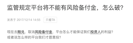 政策取消风险备付金后,一些投资者一时难以接受,有网友就曾留言,“平台怎样才能保证我们投资者的利益?没有了一点保障谁敢将自己的血汗钱借给不了解不认识的人?”
