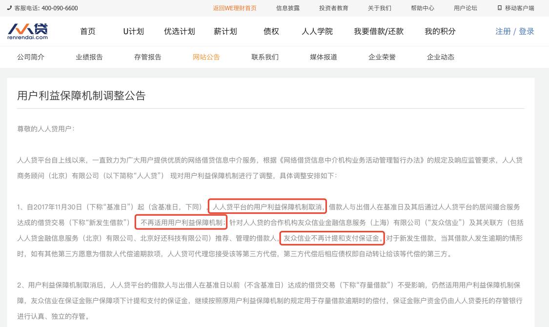 人人贷则在其官网上公告称,从11月30日起取消用户利益保障机制,人人贷的合作机构及其关联方推荐、管理的借款人,合作机构不再计提和支付保证金。