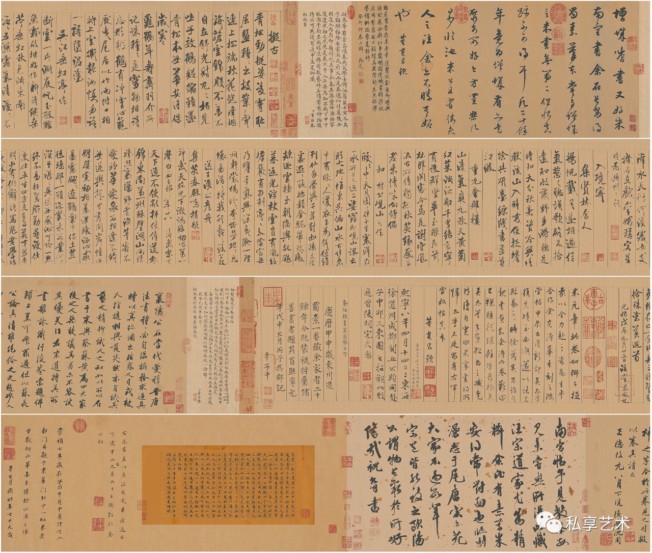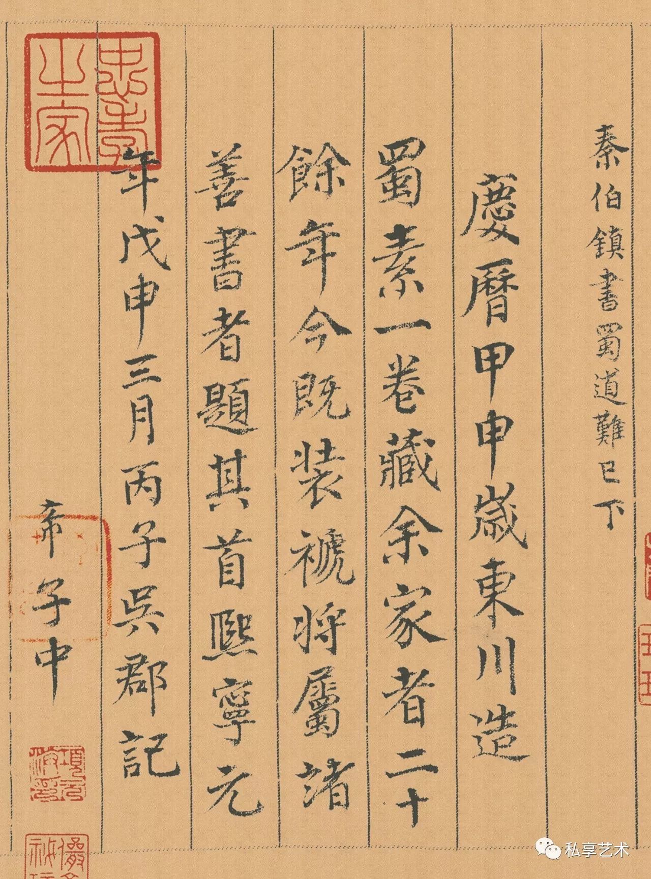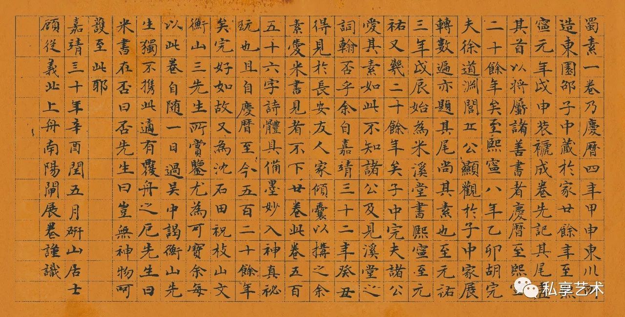 明代顾从义楷书题跋:蜀素一卷,乃庆历四年甲申(1044)东川所造。东园卲子中藏于家廿余年,至熙宁元年戊申(1068)装褫成卷。先记其尾。虚其首以将属诸善书者。庆历至熙宁,二十余年矣。至熙宁八年乙卯(1075),胡完夫、徐道渊、闾丘公显,观于子中家。展转数遍,亦题其尾,尚其素也。至元佑三年戊辰(1088)始为米溪堂书。熙宁至元佑,又几二十余年矣。子中、完夫诸公爱其素如此,不知诸公及见溪堂之词翰否乎?余自喜靖三十二年癸丑(1553),得见于长安友人家,倾囊以构之。余素爱米书,见者不下廿卷。此卷五百五十六字,诗体具备,墨妙入神,真秘玩也。且自庆历至今,五百二十余年矣。完好如故。又为沈石田、祝枝山、文衡山三先生所赏鉴,尤为可宝。余每以此卷自随。一日过吴中,谒衡山先生,独不携此,适有覆舟之厄。先生曰:“米书在否?”曰否。先生曰:“岂无神物呵护至此耶!”嘉靖四十年辛酉(1561)闰五月,研山居士顾从义,北上舟南阳闸,展卷谨识。